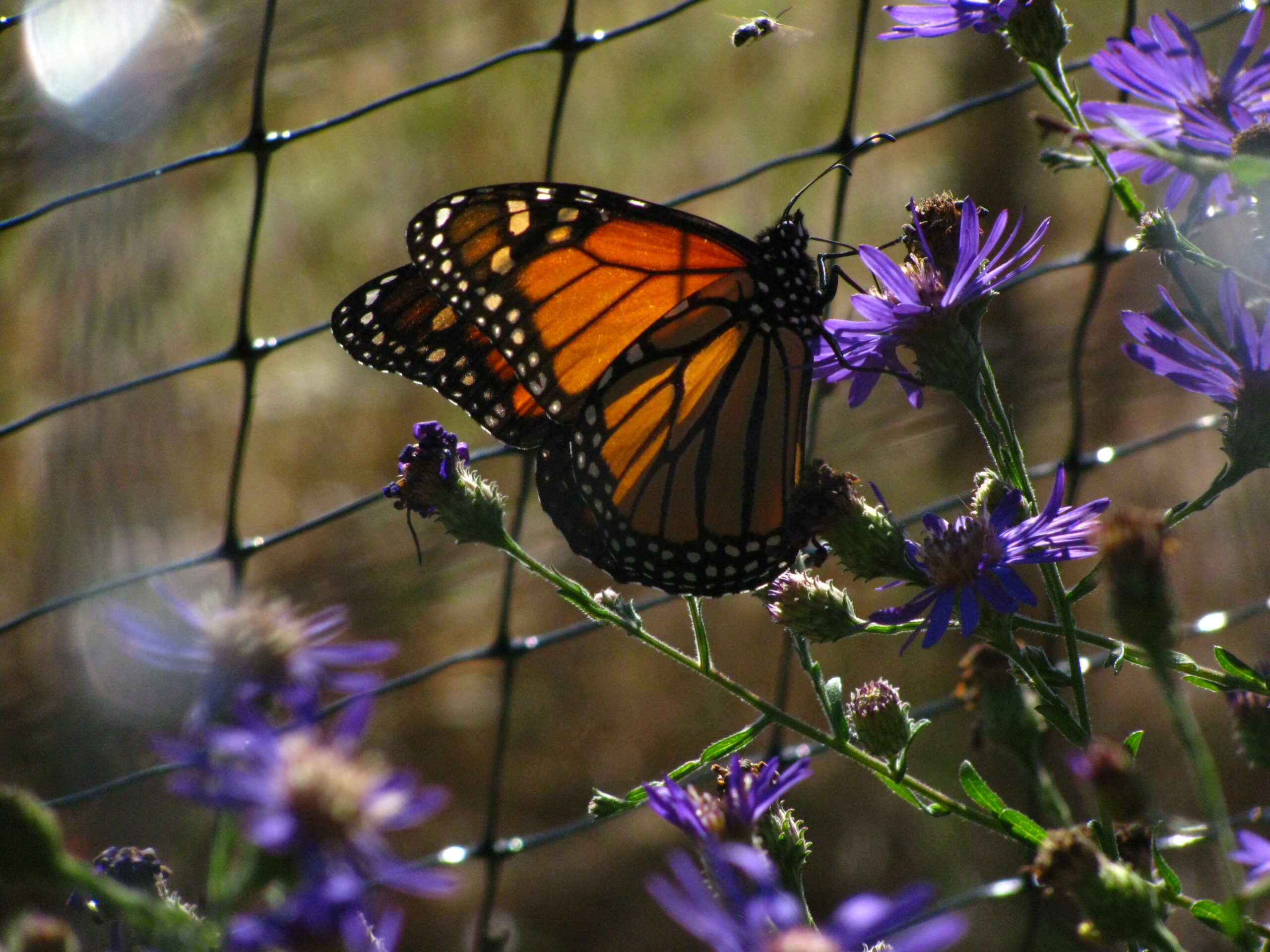 This is a newly hatched Monarch feeding on the nectar of a Georgia Aster flower. This is also a good example of why you need butterfly host plants AND flowering nectar plants to support a healthy population of butterflies in your garden. If this butterfly had hatched and there was no food in the area she might have perished, but there were multiple species of plants flowering within 30 yards of the milkweed so she had plenty to eat. Hopefully it provided a good first meal for the incredible journey to Mexico or South Florida that this lady is about to embark upon.