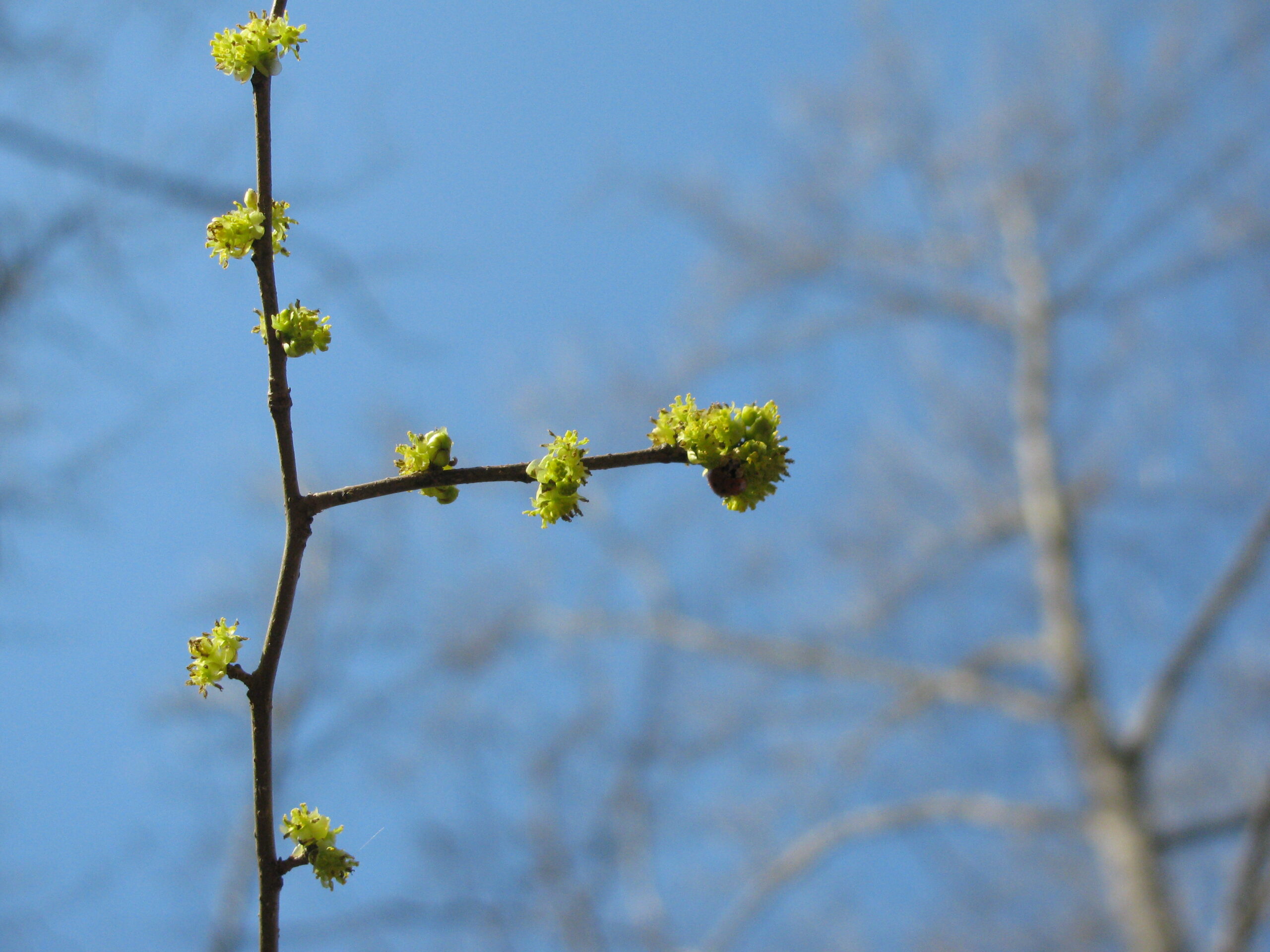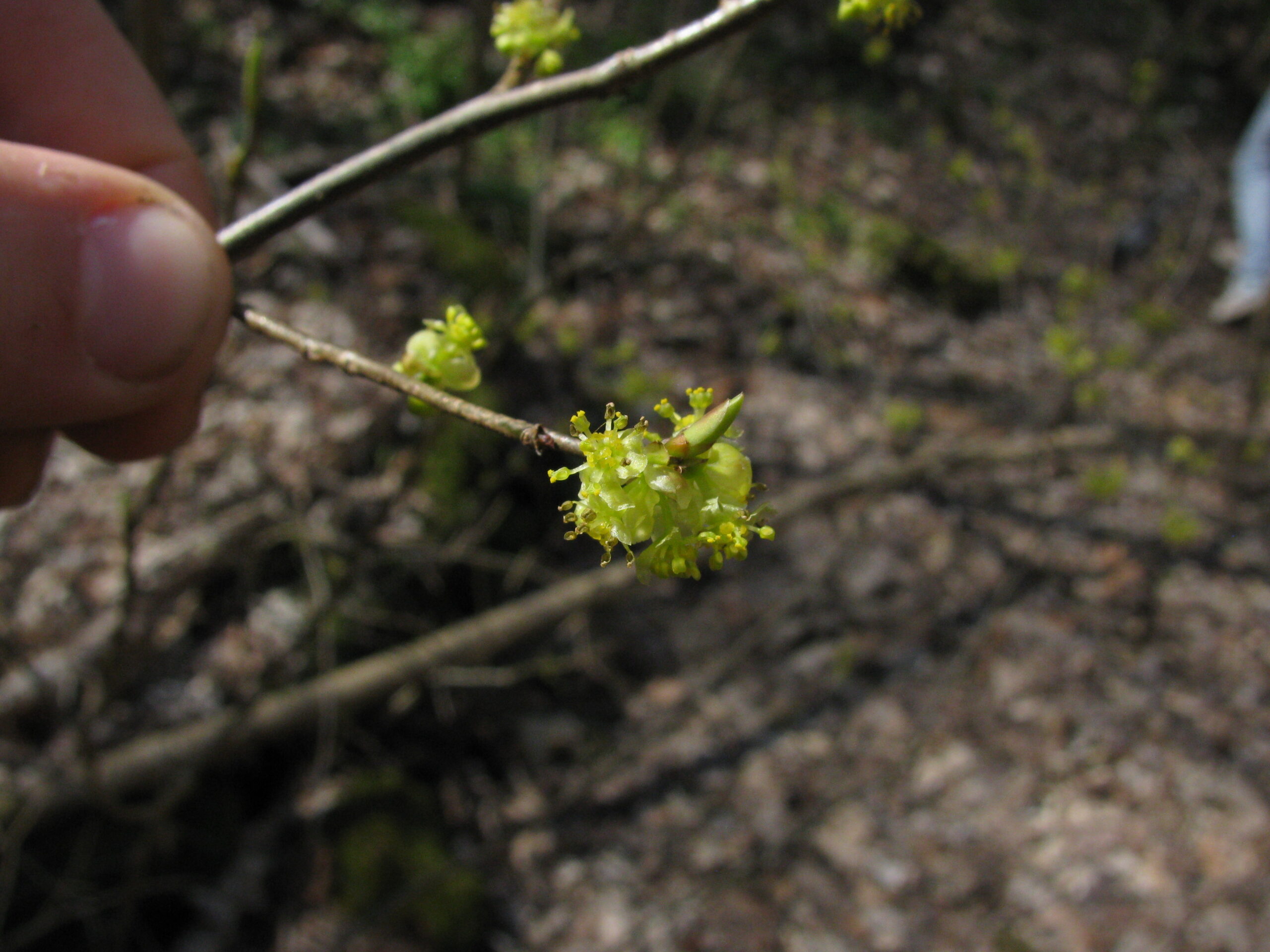 The sides of the boadwalk are lined with Spicebushes (Lindera bezoin) which were just starting to flower and extend their leaves. The flowers bloom before the leaves unfold and flatten out. Another interesting aspect of this plant is that it is dioecious, meaning that there are male and female plants. The flowers are so tiny that it can be hard to distinguish the males from the females, but I think I learned how with the help of a hand lens.