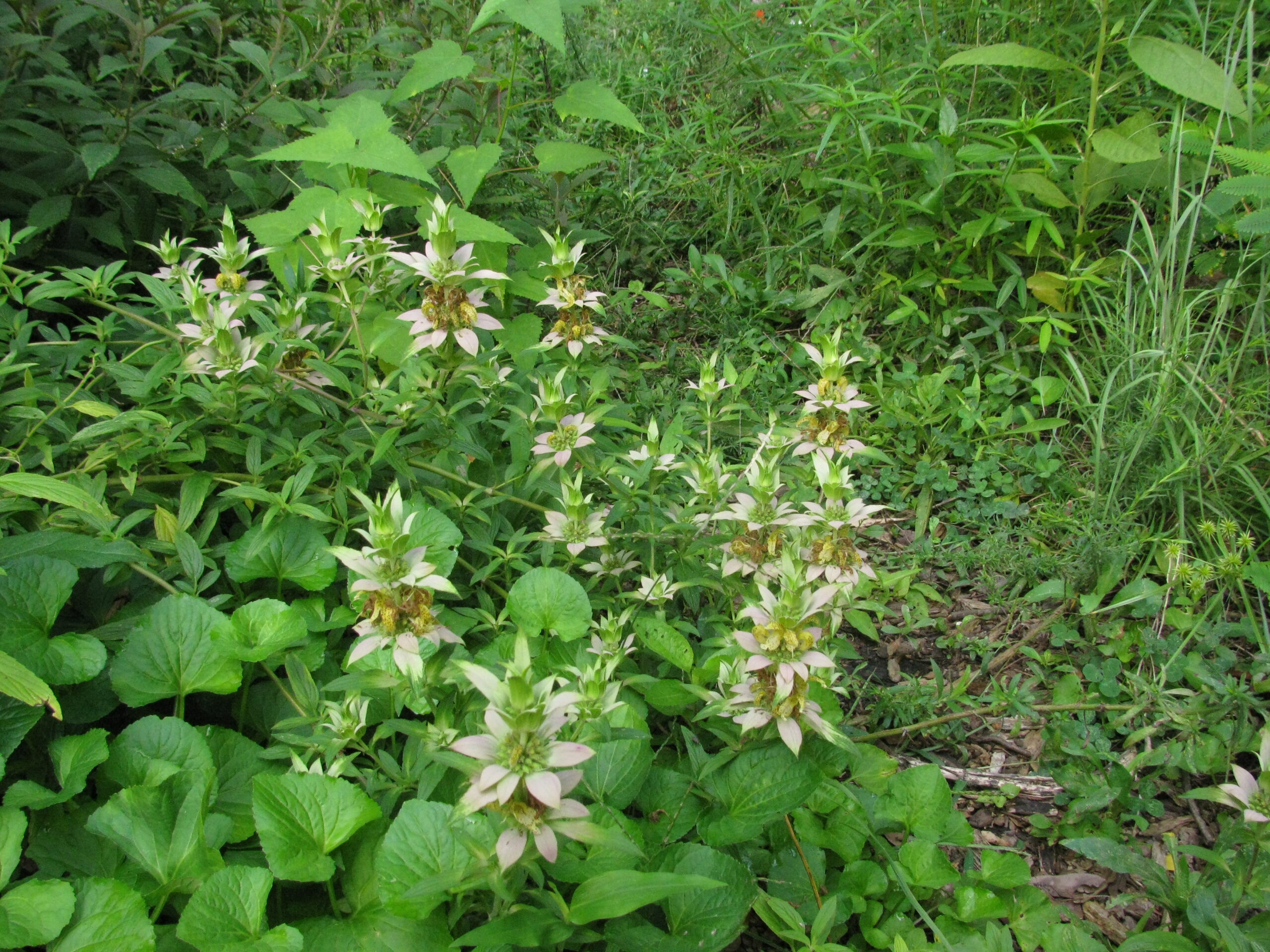 One of my favorites, Spotted Beebalm (Monarda punctata), sending out multiple stems. This is a clumping mint, not a running one, so it won’t spread quite as fast as some of the other members of the mint family. The flowers are truly unique in their color and structure. This picture is from last summer just so you get the idea: